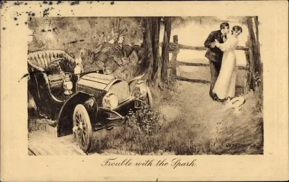 Künstler Ak Trouble with the Spark, Liebespaar, Auto