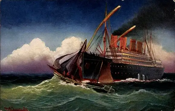 Künstler Ak Übergesegelt, Dampfer fährt gegen Segelboot