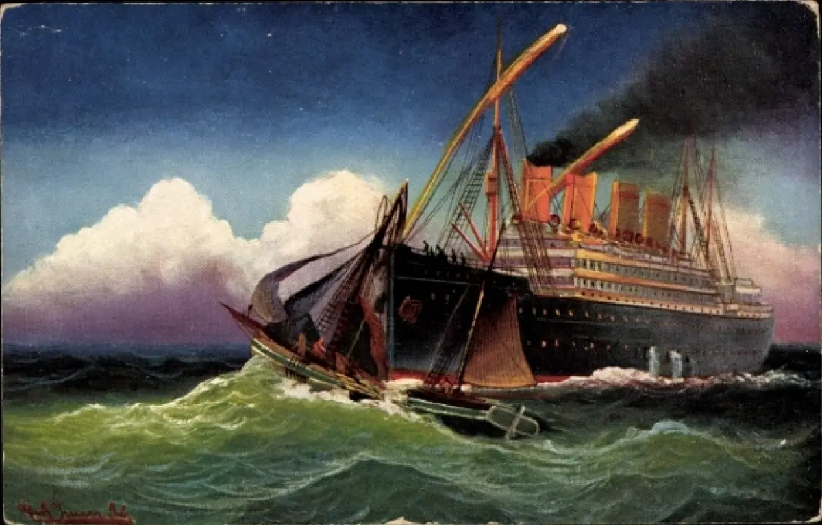 Künstler Ak Übergesegelt, Dampfer fährt gegen Segelboot