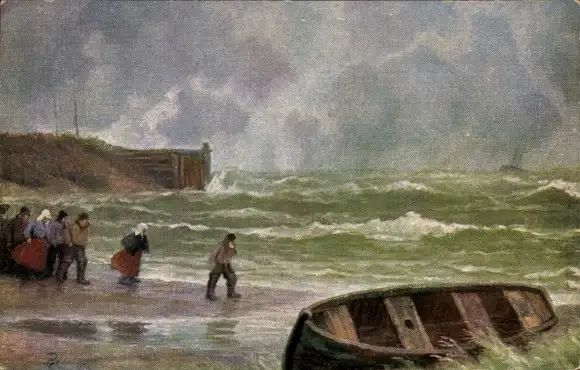 Künstler Ak Uferpartie, stürmisches Meer, Boot