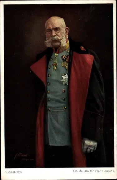 Künstler Ak Ulmer, H., Kaiser Franz Joseph I., Standportrait in Uniform, Orden, Mantel