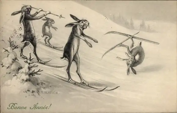 Künstler Ak Ulreich, F., Glückwunsch Neujahr, Hasen fahren Ski