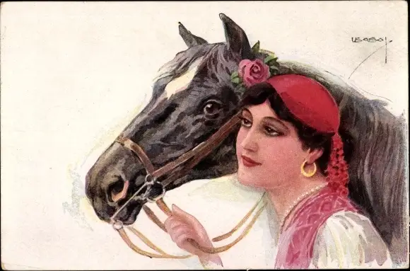 Künstler Ak Usabal, Luis, Frau in Tracht, Pferd