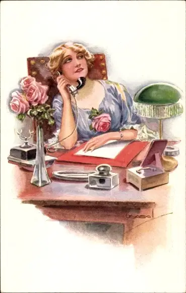 Künstler Ak Usabal, Luis, Telefonierende Frau am Schreibtisch, Telefon