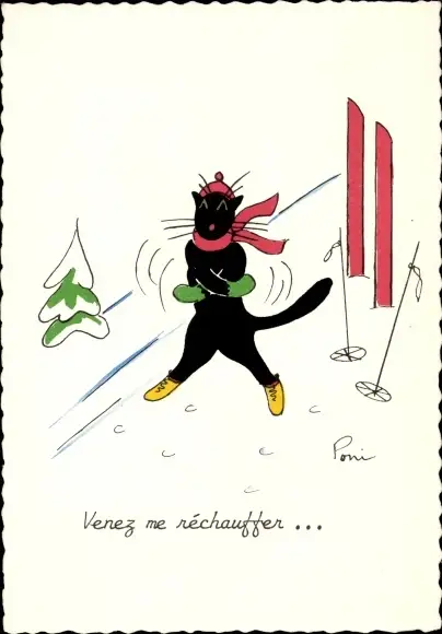Künstler Ak Venez me nechauffer, vermenschlichte Katze, Skier