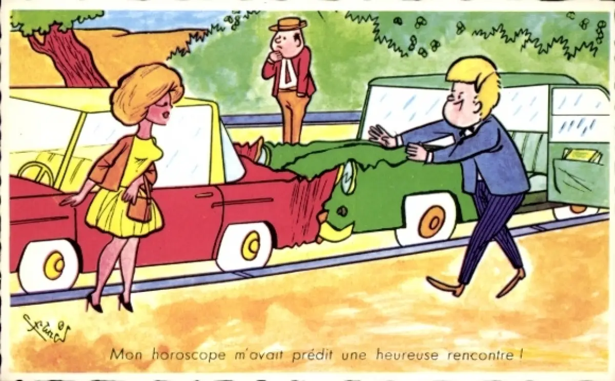Künstler Ak Verkehrsunfall, Mann beruhigt eine Frau, Autounfall