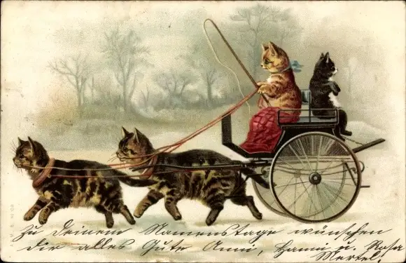 Künstler Ak Vermenschlichte Katzen, Kutsche