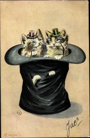 Künstler Ak Vermenschlichte Katzen im Zylinder, Monokel