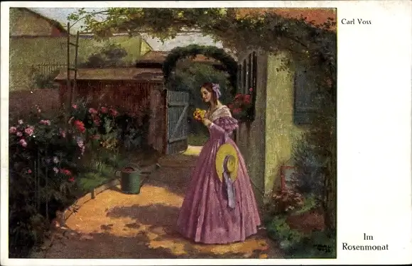 Künstler Ak Voss, C., Im Rosenmonat, Frau im Blumengarten