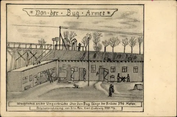 Künstler Ak Wachtlokal an der Ungarbrücke über den Bug, I WK