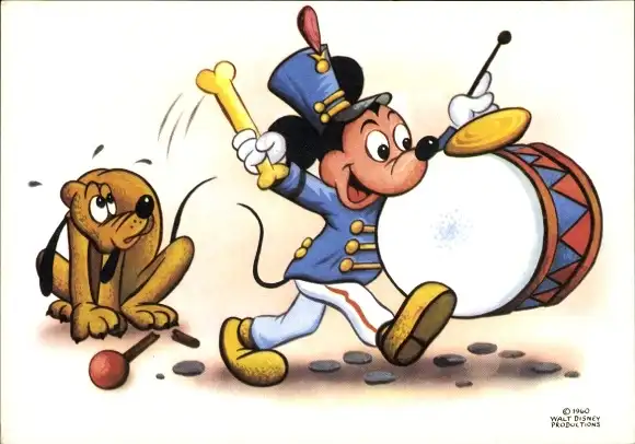 Künstler Ak Walt Disney, Micky Maus, Pluto, Trommel