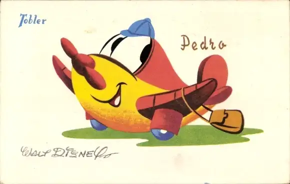 Künstler Ak Walt Disney, Pedro, vermenschlichtes Flugzeug, Reklame Tobler