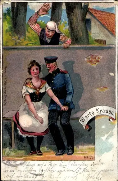 Künstler Ak Warte Krause, Soldat flirtet mit Mädchen
