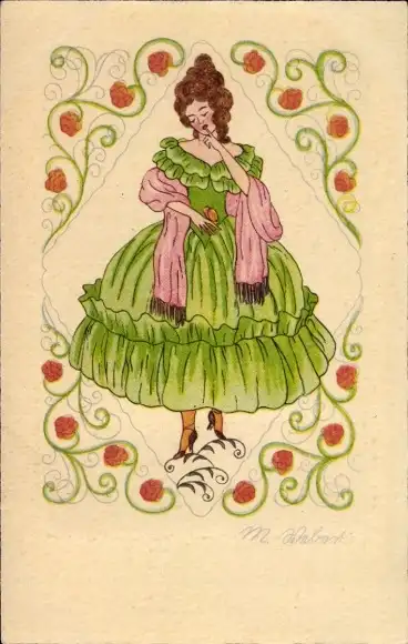 Künstler Ak Weber, M., Gemaltes Frau-Porträt, Blumen, Grünes Kleid