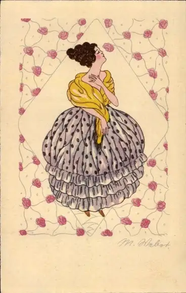 Künstler Ak Weber, M., Gemaltes Frau-Porträt, Kleid, Blumen