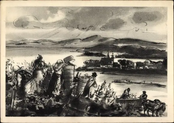 Künstler Ak Weinlese, Erntehelfer auf dem Weinberg
