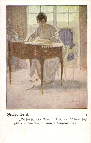 Künstler Ak Wennerberg, Bruno, Feldpostbrief, Frau beim Schreiben, neunte Kriegsanleihe