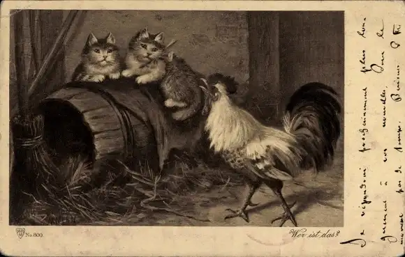 Künstler Ak Wer ist das? zwei Katzen, Hahn