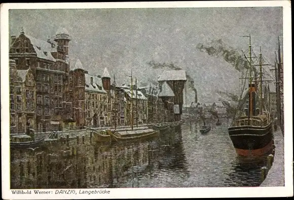 Künstler Ak Werner, W., Gdańsk Danzig, Langebrücke, Krantor, Dampfer