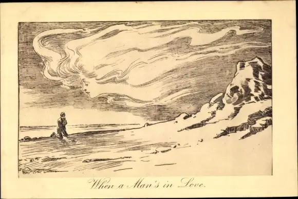 Künstler Ak When a man's in love, woman's face in cloud, man on the beach