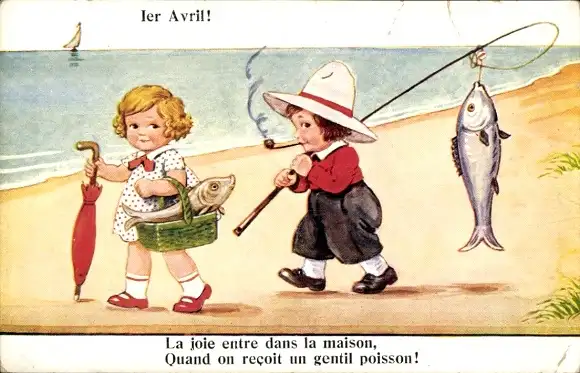 Künstler Ak Wills, John, 1. April, Angler mit Fisch an der Angel, Strand