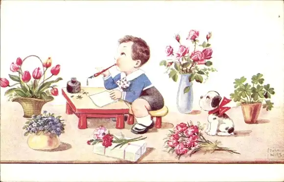 Künstler Ak Wills, John, Junge schreibt einen Brief, Blumen, Hund