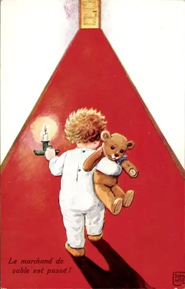 Künstler Ak Wills, John, Kind im Schlafanzug geht zu Bett, Teddybär, Kerze