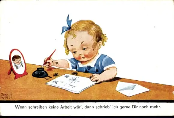 Künstler Ak Wills, John, Mädchen schreibt einen Brief, Tintenfass, Tintenflecke