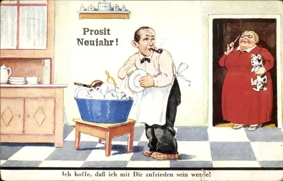 Künstler Ak Wills, John, Mann spült Geschirr, Frau beobachtet ihn