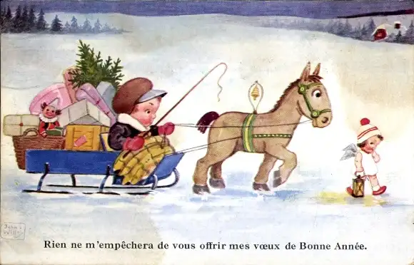 Künstler Ak Wills, John, Neujahr, Schlitten, Geschenke, Tannenbaum, Engel