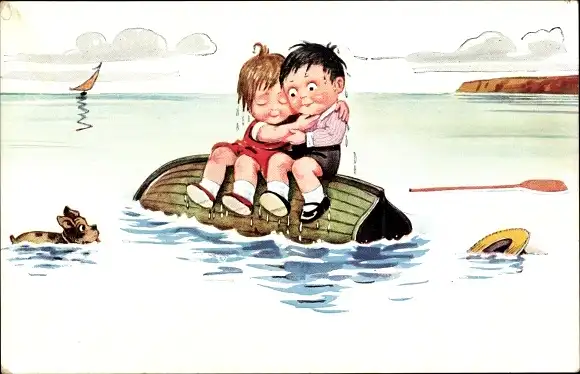 Künstler Ak Wills, John, Paar auf einem gekenterten Boot, Hund