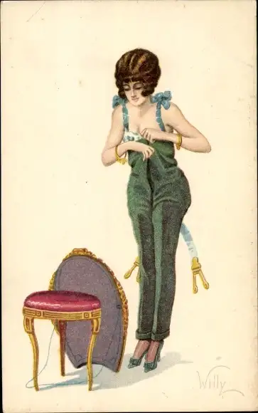 Künstler Ak Willy, Frau zieht sich um, Mode, Sitzhocker