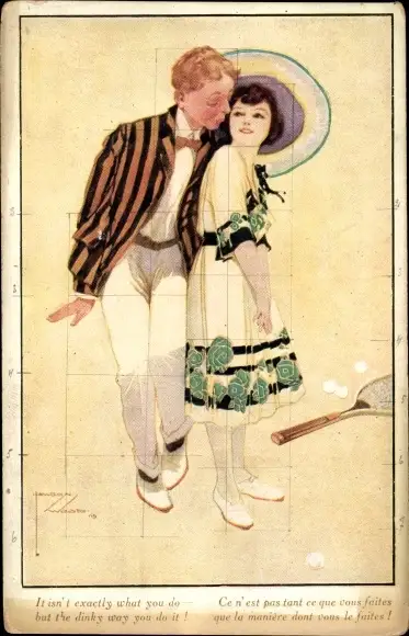 Künstler Ak Wood, L., Liebespaar, Kuss, Tennisschläger, It isn't exactly what you do...