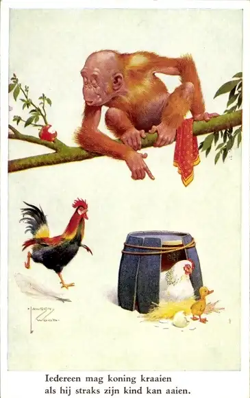 Künstler Ak Wood, Lawson, Affe, Hahn, Huhn, Küken, Orang Utan