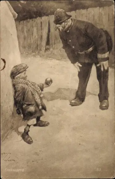 Künstler Ak Wood, Lawson, Junge reicht Polizist geklauten Apfel