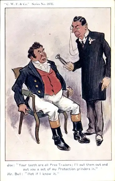 Künstler Ak Your teeth are all Free Traders, Joseph Chamberlain, John Bull