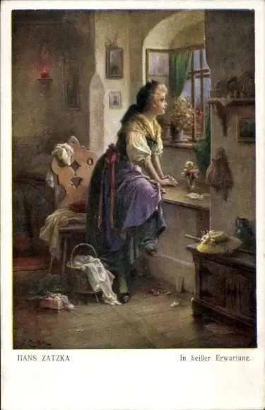 Künstler Ak Zatzka, Hans, In heißer Erwartung, Frau sitzt auf Fensterbrett