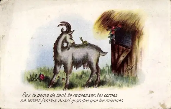 Künstler Ak Ziege und Schnecke, Rosen