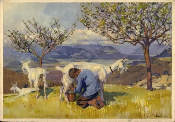 Künstler Ak Ziegenhirte beim Melken, Landschaftsidylle