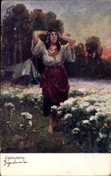 Künstler Ak Zigeunerin auf einer Blumenwiese