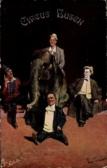 Künstler Ak Zirkus Busch, Elefant, Clowns