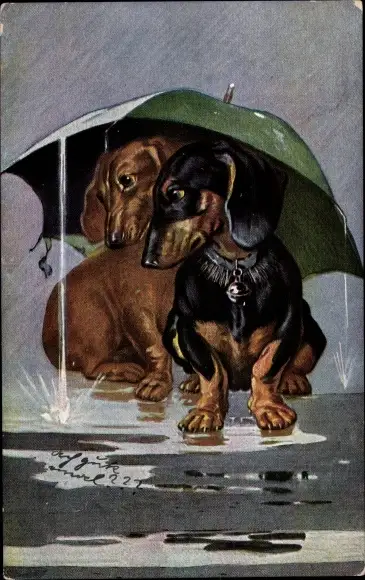 Künstler Ak Zwei Dackel unter einem Regenschirm