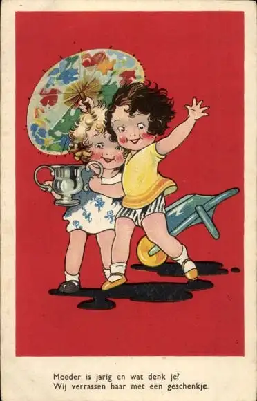 Künstler Ak Zwei Mädchen mit Sonnenschirm, Schubkarre