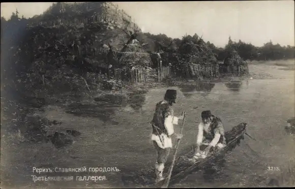 Künstler Ak Zwei Männer in russischen Trachten in einem Boot