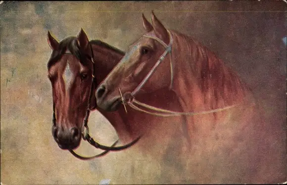 Künstler Ak Zwei braune Pferde mit Zaumzeug