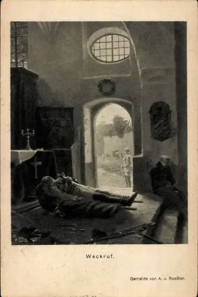 Künstler Ak v. Roeßler, A., Weckruf, Soldat auf einer Bahre in einer Kirche