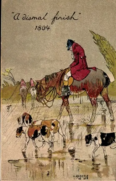 Künstler Litho Anders, O., Missglückte Jagd, Jäger, Jagdhunde, Pferd