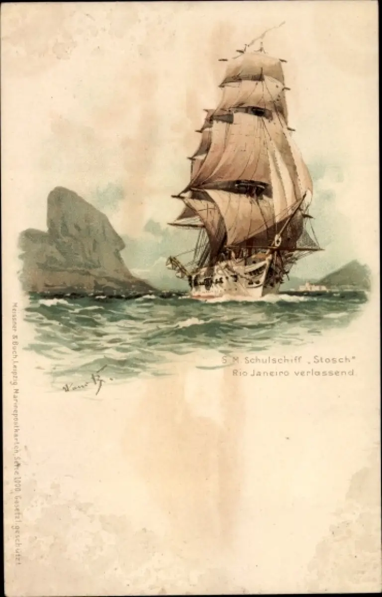 Künstler Litho Bohrdt, Deutsches Kriegsschiff, Segelschulschiff Stosch Rio de Janeiro verlassend