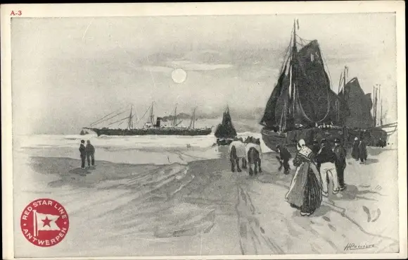 Künstler Litho Cassiens, H., Red Star Line Antwerpen, Dampfschiff, Dampfer, Trachten, Segelboote