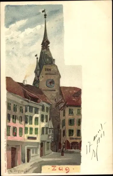 Künstler Litho Dussault, Zug Stadt Schweiz, Blick auf den Zeitturm, Uhrenturm